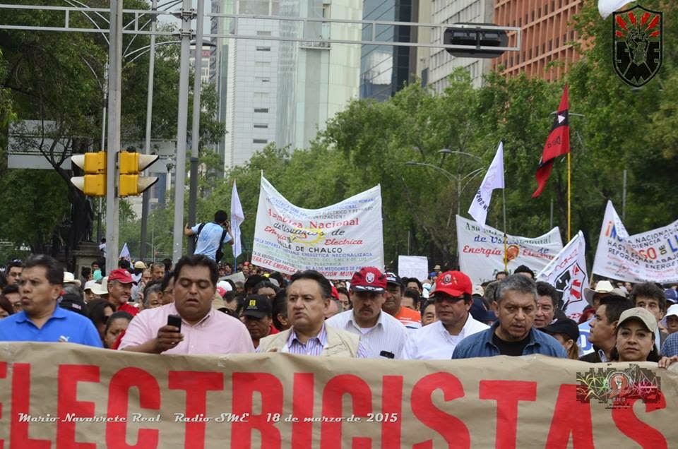 miércoles 18 de marzo de 2015.- Para Radio SME Mario Navarrete Real.- Desde antes de las 16:00 horas electricistas en Resistencia del Sindicato Mexicano de Electricistas (SME) y usuarios de la energía eléctrica provenientes de los diferentes rumbos de la ciudad de México y de los Municipios conurbados quienes ya rodeaban la glorieta de la columna del Ángel de la Independencia, lugar de la cita, hora? las 16:00 en punto para marchar desde ahí hasta la segob.